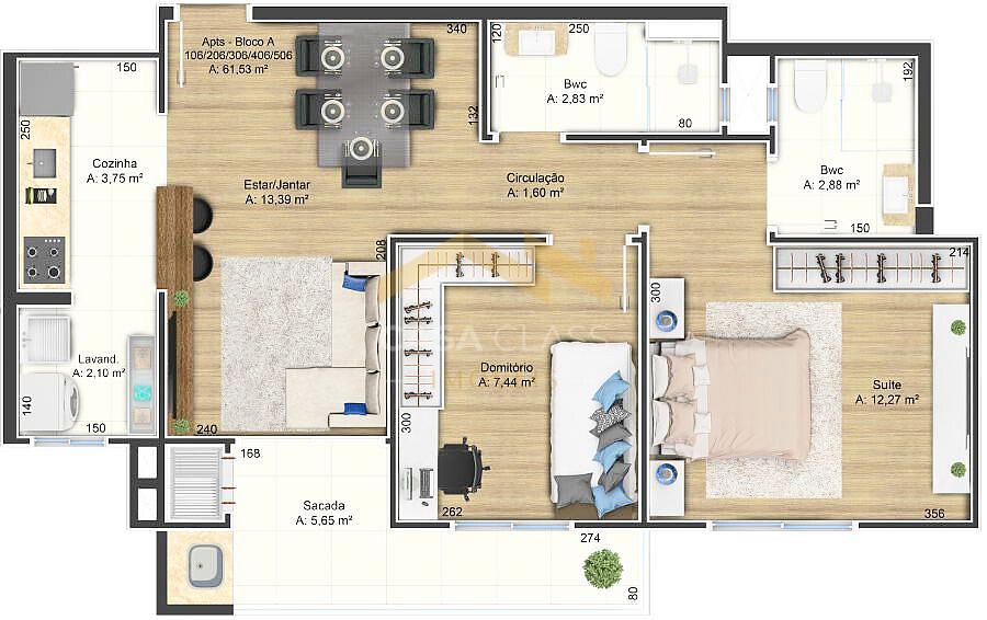 São 61,78 m² de área privativa, contendo 01 suíte + 01 dormitório, banheiro social, salas de estar e jantar integradas com a cozinha, lavanderia separada e sacada com churrasqueira.