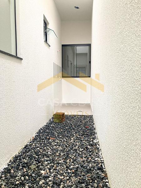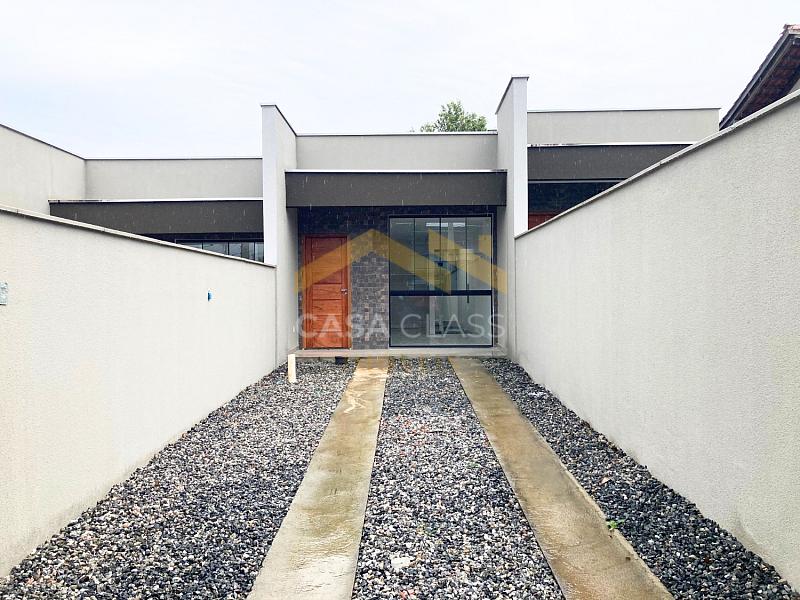 A casa possui 70 m², contendo 01 suíte + 02 dormitórios, lavanderia separada e espaço de terreno na frente para 02 vagas de garagem.